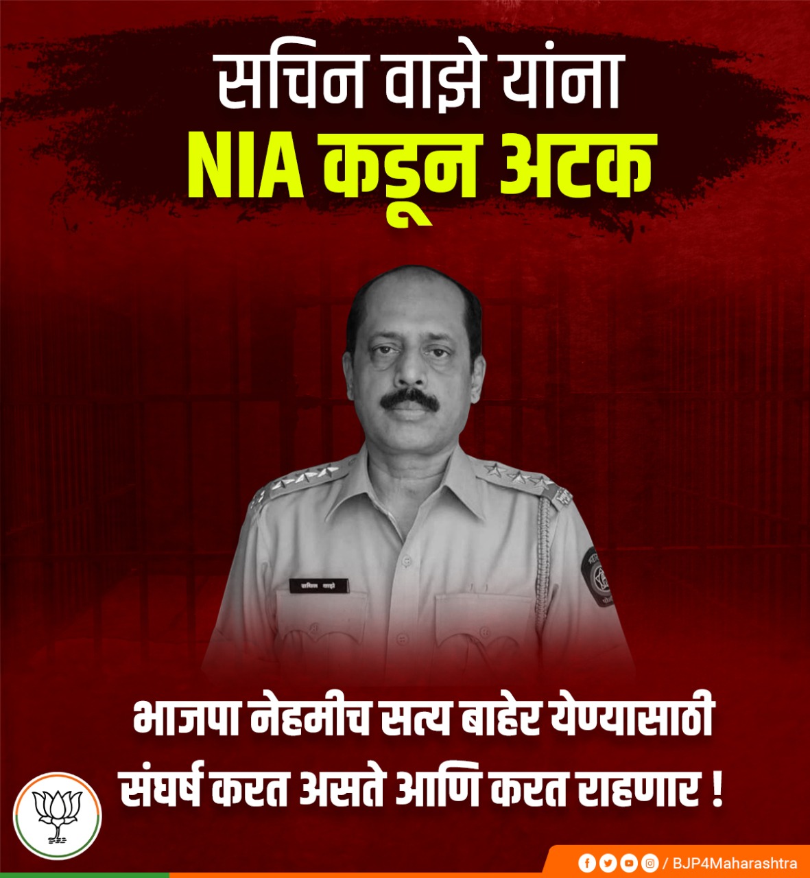 याप्रकरणी महाराष्ट्र भाजपा ने ट्विट करून म्हटलं आहे की मनसुख हिरेन मृत्यूप्रकरणी त्यांच्या पत्नीने केलेले आरोप, पुरावे नष्ट करण्याचा प्रयत्न झाल्याचे ATSचे मत आहे.या पार्श्वभूमीवर वादग्रस्त पोलिस अधिकारी सचिन वाझे यांना NIA कडून अटक झाली आहे. हिरेन कुटुंबाला न्याय मिळेपर्यंत संघर्षाचा शब्द भाजपाने पाळलाय. सत्य सर्वांसमोर येईलच.