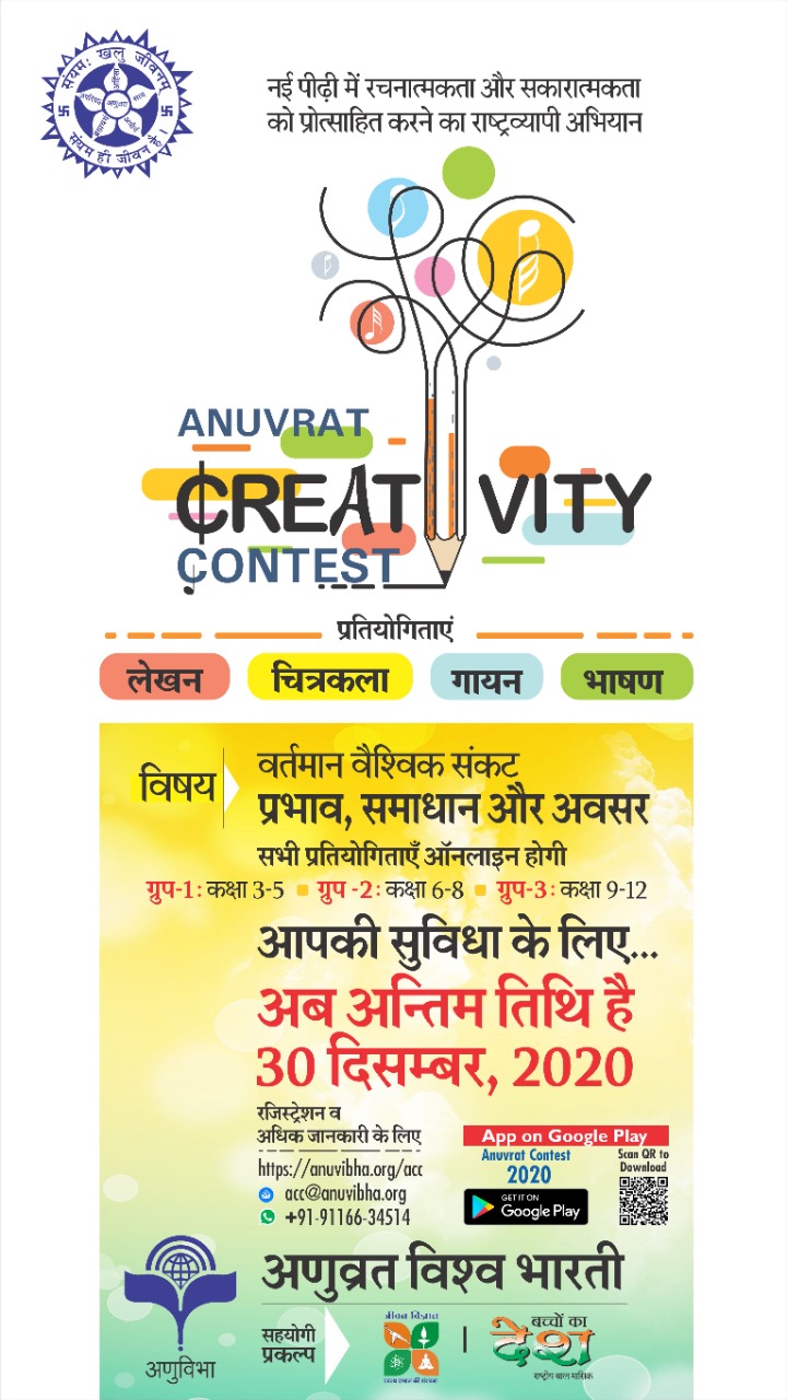 जळगाव, (प्रतिनिधी) – तेरापंथ धर्मसंघाचे नववे आचार्य व युगप्रवर्तक आचार्य तुलसीजी यांच्या अधिपत्याखालील “अणुव्रत आंदोलन” या संस्थेची प्रतिनिधी संस्था “अणुव्रत विश्वभारती राजसमंद” द्वारा “अणुव्रत क्रिएटिविटी” स्पर्धेचे ऑनलाईन आयोजन करण्यात आले आहे.यात इयत्ता तिसरी ते बारावी पर्यंतच्या विद्यार्थ्यांसाठी गायन, चित्रकला, वक्तृत्व, काव्य व निबंध स्पर्धेचे आयोजन करण्यात आले आहेत.