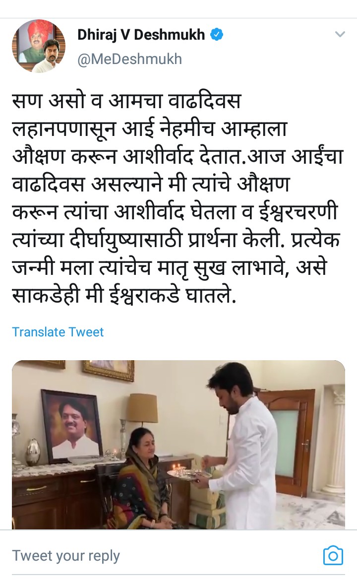 सण असो व आमचा वाढदिवस लहानपणासून आई नेहमीच आम्हाला औक्षण करून आशीर्वाद देतात.आज आईंचा वाढदिवस असल्याने मी त्यांचे औक्षण करून त्यांचा आशीर्वाद घेतला व ईश्वरचरणी त्यांच्या दीर्घायुष्यासाठी प्रार्थना केली. प्रत्येक जन्मी मला त्यांचेच मातृ सुख लाभावे, असे साकडेही मी ईश्वराकडे घातले… हे ट्विट केले आहे लातूर ग्रामीण चे काँग्रेस आमदार धीरज विलासराव देशमुख यांनी…