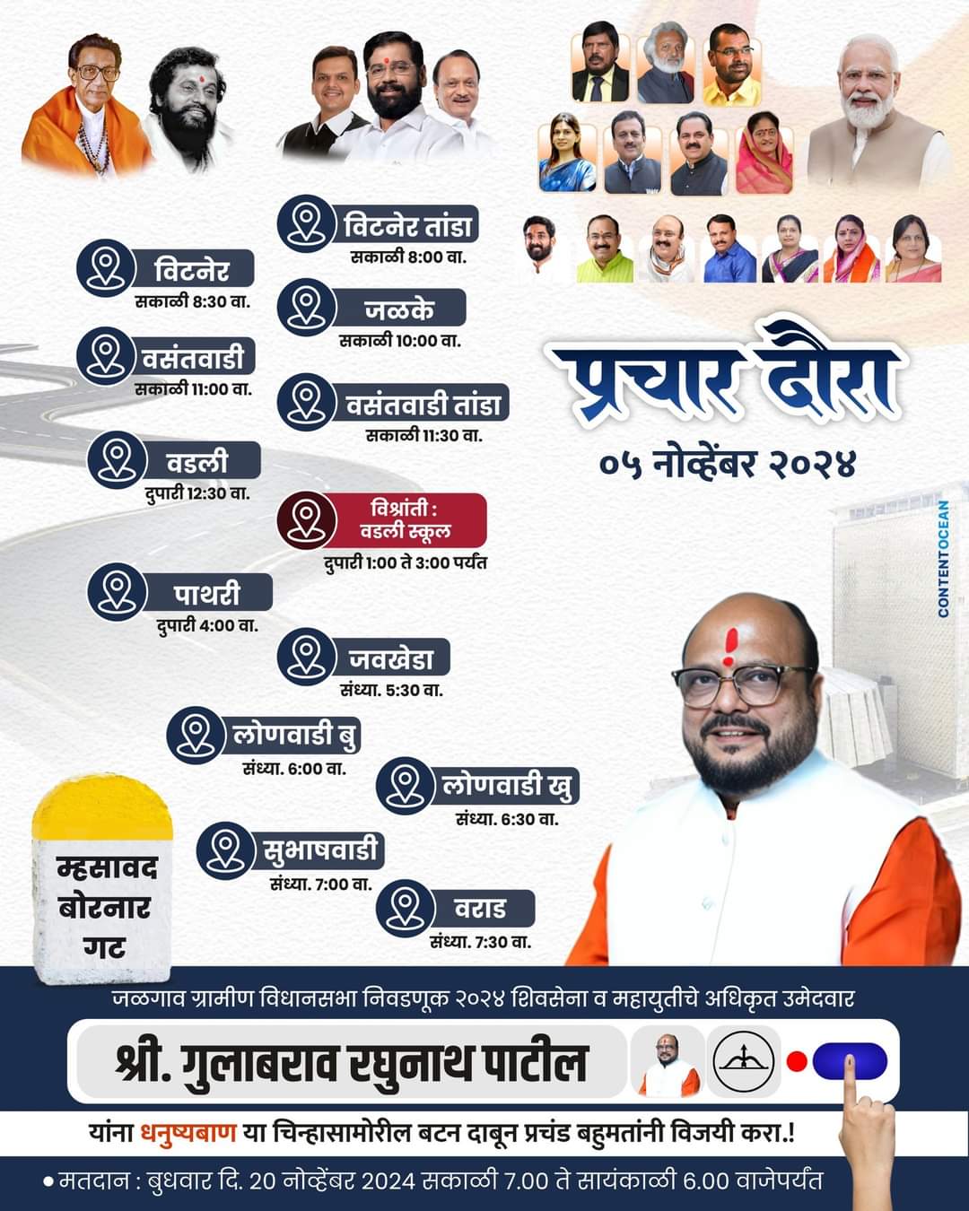 निवडणुकीच्या पार्श्वभूमीवर मंत्री गुलाबराव पाटील यांनी ग्रामीण मतदार संघ पिंजून काढला असून आज दिनांक ०५ नोव्हेंबर २०२४ रोजी म्हसावद बोरनार गटात ना.गुलाबराव पाटील यांचा प्रचार दौरा होणार आहे