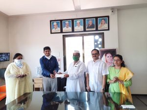 राज्यातील कोरोना आजाराच्या पाश्वभूमीवर गरजू रुग्णांना मदतीसाठी संस्थेचे चेअरमन नानासाहेब प्रतापराव हरी पाटील यांच्या शुभहस्ते शासकीय स्तरावर पाचोरा विभागाचे प्रांताधिकारी राजेंद्र कचरे भडगाव तहसिलदार माधुरी आंधळे नायब तहसिलदार रमेश देवकर यांच्याकडे संस्थेच्या कार्यालयात मुख्यमंत्री सहाय्यता निधी (Covid 19 )कडे जमा करण्यासाठी एक लाख अकरा हजार एकशे अकरा रुपयांचा धनादेश सुपूर्द करण्यात आला याप्रसंगी संस्थेचे संचालक दादासो.प्रशांतराव विनायक पाटील ताईसो.डाँ.पूनम प्रशांतराव पाटील व ग.स.सोसायटी चे माजी अध्यक्ष विलास नेरकर सकाळ वृत्तसमूहाचे प्रतिनिधी सुधाकर पाटील आदी मान्यवर उपस्थित होते.