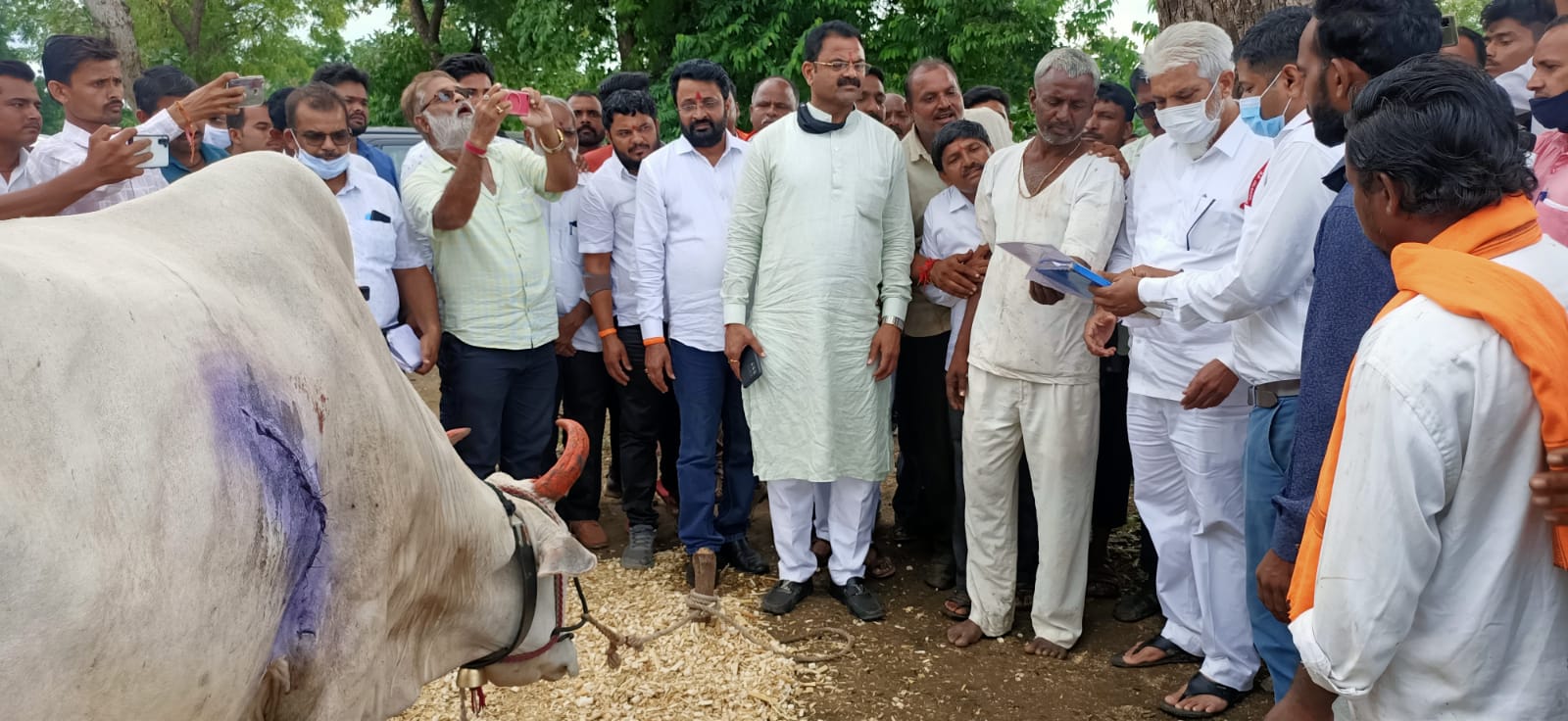 जामनेर तालुक्यातील काही गावात चार दिवसापूर्वी झालेल्या चक्री वादळामुळे शेतीचे व घरांचे मोठ्या प्रमाणात नुकसान झाले आहेत. ओझर येथे घरावरील पत्रा उडून बैलावर पडल्याने बैल गंभीर जखमी झाला होता. मंत्री श्री. भुसे व आमदार किशोर पाटील यांनी आज बैल मालक श्री. रमेश माळी यांची भेट घेतली. पशु वैद्यकीय अधिका-र्यांनी ३० टाके घालुन बैलाचे प्राण वाचविले. बैलाच्या उपचारावर होणारा खर्च शासन करेल असेही त्यांनी सांगितले.