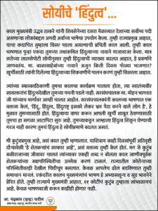 शिवसेनेच्या दसरा मेळाव्यात काल मुख्यमंत्री यांनी अर्वाच्च भाषा एका अभ्यास शून्य भाषणातून केली आहे, राज्य प्रमुख असूनही आपल्या भाषणात एकही सेकंद शेतकऱ्यांसाठी दिला नाही, मग त्या पदाचा काय उपयोग अशी टीका चंद्रकांत पाटील यांनी ट्विट करून केली असून सोबत ‘सोयीचे हिंदुत्व’या मथड्याखाली लिहलेलं मजकुराचे पोस्टर पण ट्विट केलं आहे.