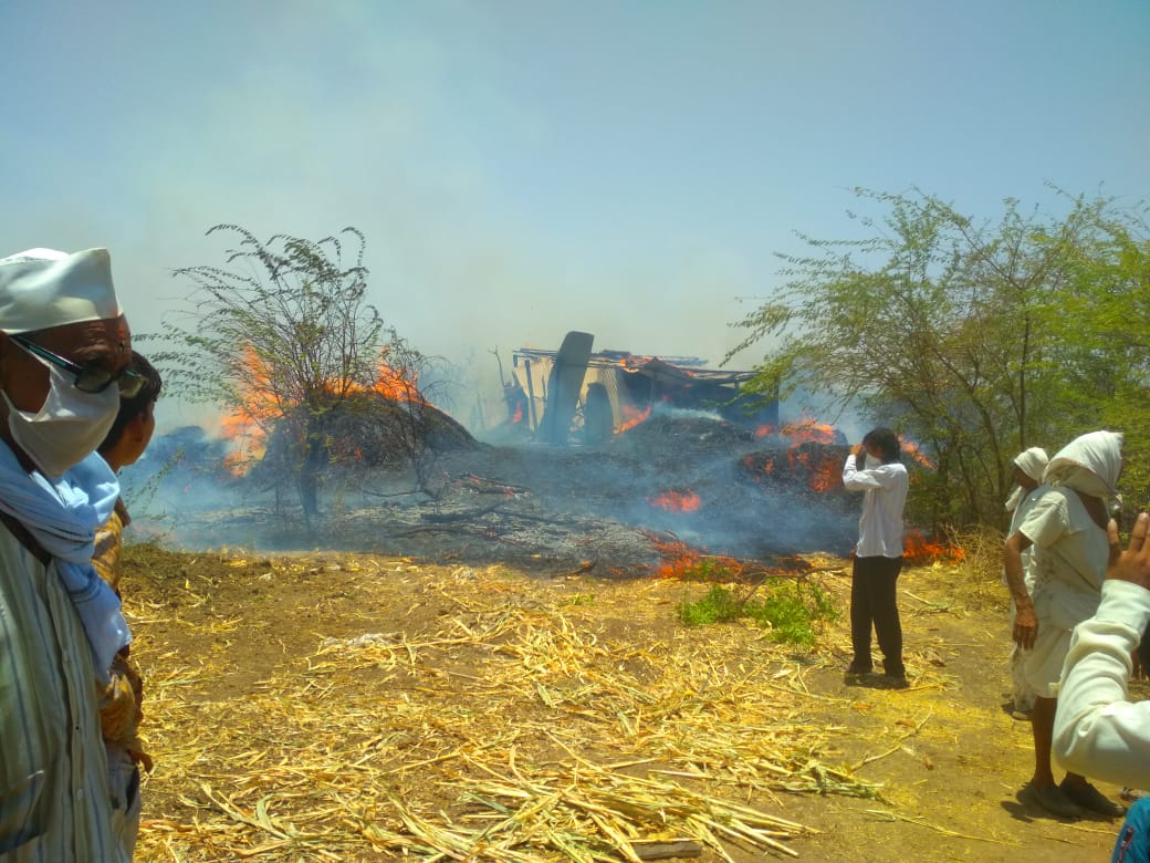 मनवेल ता.यावल (वार्ताहर ) – येथुन जवळच असलेल्या थोरगव्हाण येथील जानकीराम नामदेव पाटील यांच्या खळ्यातील चाऱ्याला आग लागली असे गावात समजताच गावकऱ्यांनी आग विझवण्यासाठी धाव घेतली परंतु अतोनात प्रयत्न करून आग विझत नसल्यामुळे पोलीस पाटील गजानन चौधरी यांनी यावल पोलीस निरीक्षक अरुण धनवडे यांच्याशी संपर्क साधून यावल नगर पालीकेचा अग्निशामक यंत्रणा बोलवण्यात आली.गाडी येते तोपर्यंत आग इतकी वाढली की मारुती नामदेव पाटील यांचे चाऱ्याने भरलेले शेड व बैलगाडी व इतर शेती अवजारे जळून खाक झाले. त्यानंतर अग्निशामक दलाच्या सहाय्याने आग विझवण्यात आली. घटनास्थळी तलाठी एस. एस. तायडे यांनी नुकसानाच्या पंचनामा केला आहे. गावकऱ्यांनी सहकार्य केल्याने सुदैवाने जीवित हानी टळळी असुन चाऱ्या , शेतीचे अवजारे, बैलगाडी मोठ्या प्रमाणात नुकसान झाले आहे.