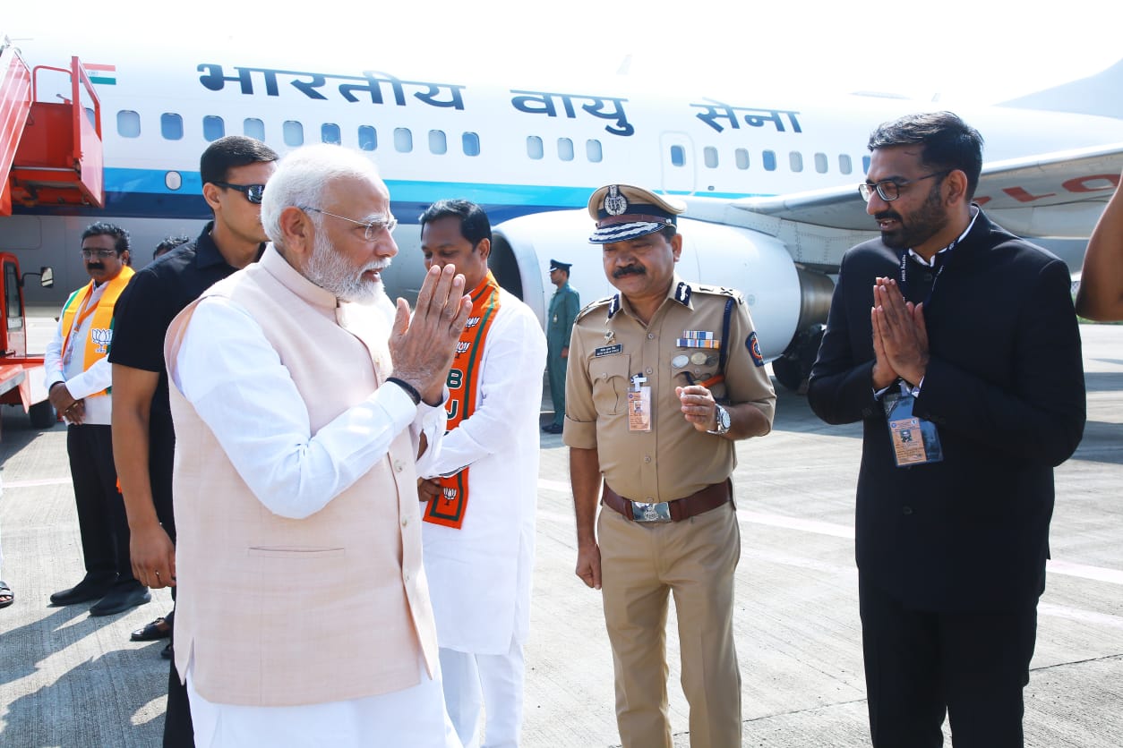 नांदेड दि. ५ ऑक्टोबर :- बंजारा समाजाचे श्रद्धास्थान असलेल्या पोहरादेवी येथे नंगारा म्युझियम लोकार्पण व जाहीर सभेसाठी आज शनिवारी ५ ऑक्टोबरला प्रधानमंत्री नरेंद्र मोदी यांचे गुरूगोविंदसिंघजी विमानतळावर सकाळी १०.३० वाजता आगमन झाले.