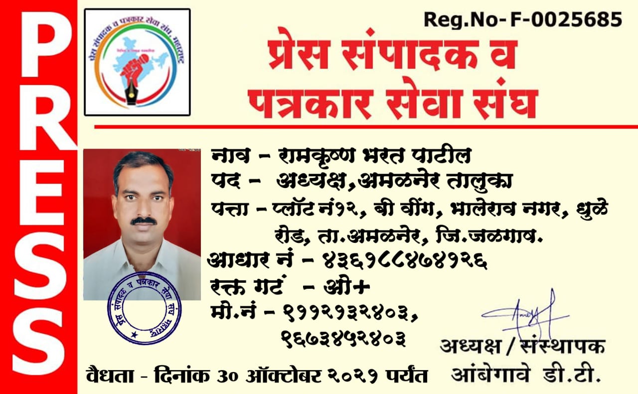 अमळनेर – येथील रहिवासी व मार्मिक समाचारचे शहर प्रतिनिधी रामकृष्ण बी.पाटील यांची प्रेस संपादक व पत्रकार सेवा संघाच्या अमळनेर तालुका अध्यक्षपदी नियुक्ती झाली आहे.संघाचे संस्थापक अध्यक्ष डी.टी.आंबेगावे यांनी सदर नियुक्ती केली आहे.रामकृष्ण बी.पाटील यांच्या नियुक्तीने सर्व स्तरावरून कौतुक व अभिनंदन होत आहे.