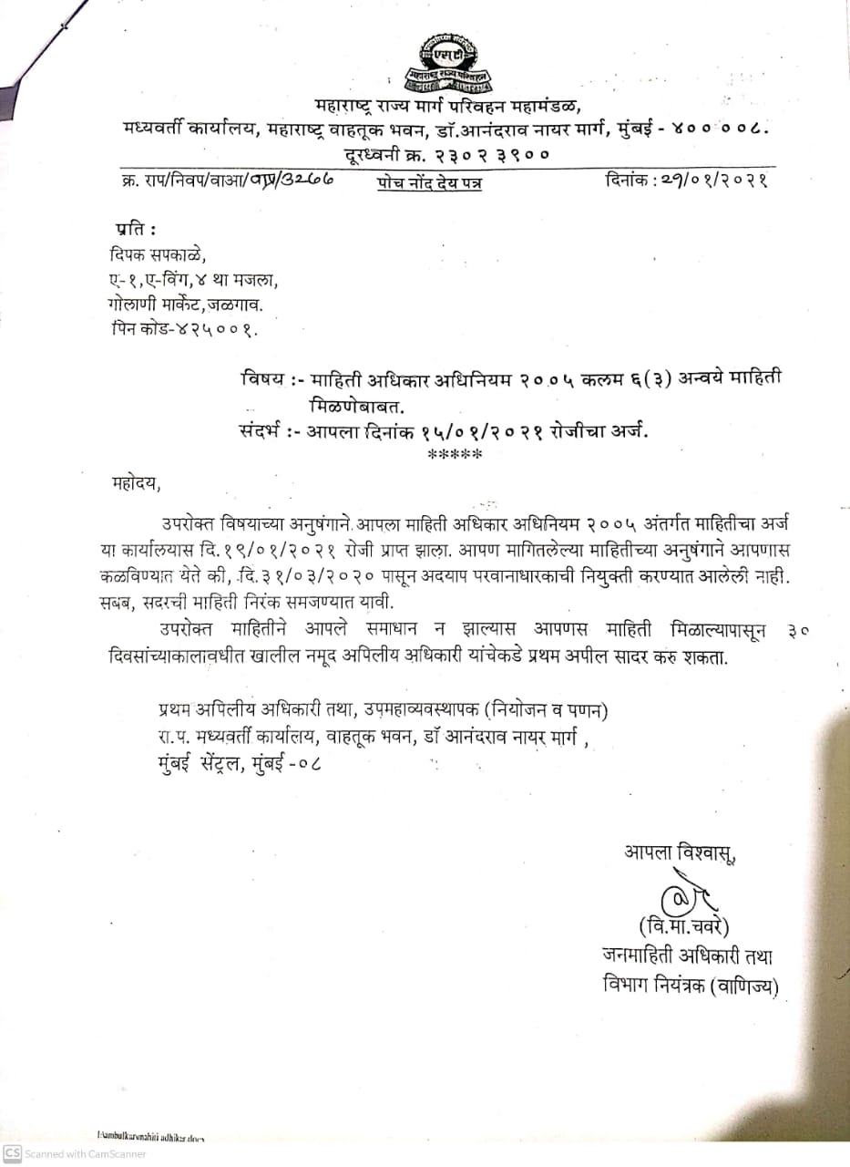 याबाबत सविस्तर असे की,महाराष्ट्र राज्य मार्ग परिवहन मंडळ अंतर्गत येणारे जळगाव येथील बसस्थानक येथे उभारण्यात आलेले फ्लेक्स / होर्डिंग्ज आवाज विरहित जाहिरात होर्डिंग्ज, साईन बोर्ड, जाहिरात प्रदर्शित करण्यासाठी दिनांक 01/04/2017 ते 31/03/2020 या कालावधी करिता परवाना देण्यात आला होता.या कालावधीची मुदत संपायला तब्बल एक वर्षाचा कालावधी उलटला असतांना या ठिकाणी गेल्या वर्षभरात होर्डिंगवर जाहिरात करण्यात येत आहे.