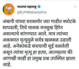 मुंबई, (प्रतिनिधी) – उद्योगपती मुकेश अंबानी यांच्या घराजवळ स्फोटकांसह पार्क करण्यात आलेल्या स्कॉर्पिओ गाडीचे मालक मनसुख हिरेन यांचा शुक्रवारी मुंब्रा रेतीबंदर येथे खाडीत मृतदेह आढळल्याने खळबळ उडाली असून भाजपा ने या प्रकरणी प्रश्न उपस्थित करत हा मृत्यू हत्या की आत्महत्या असा संशय व्यक्त केला आहे.