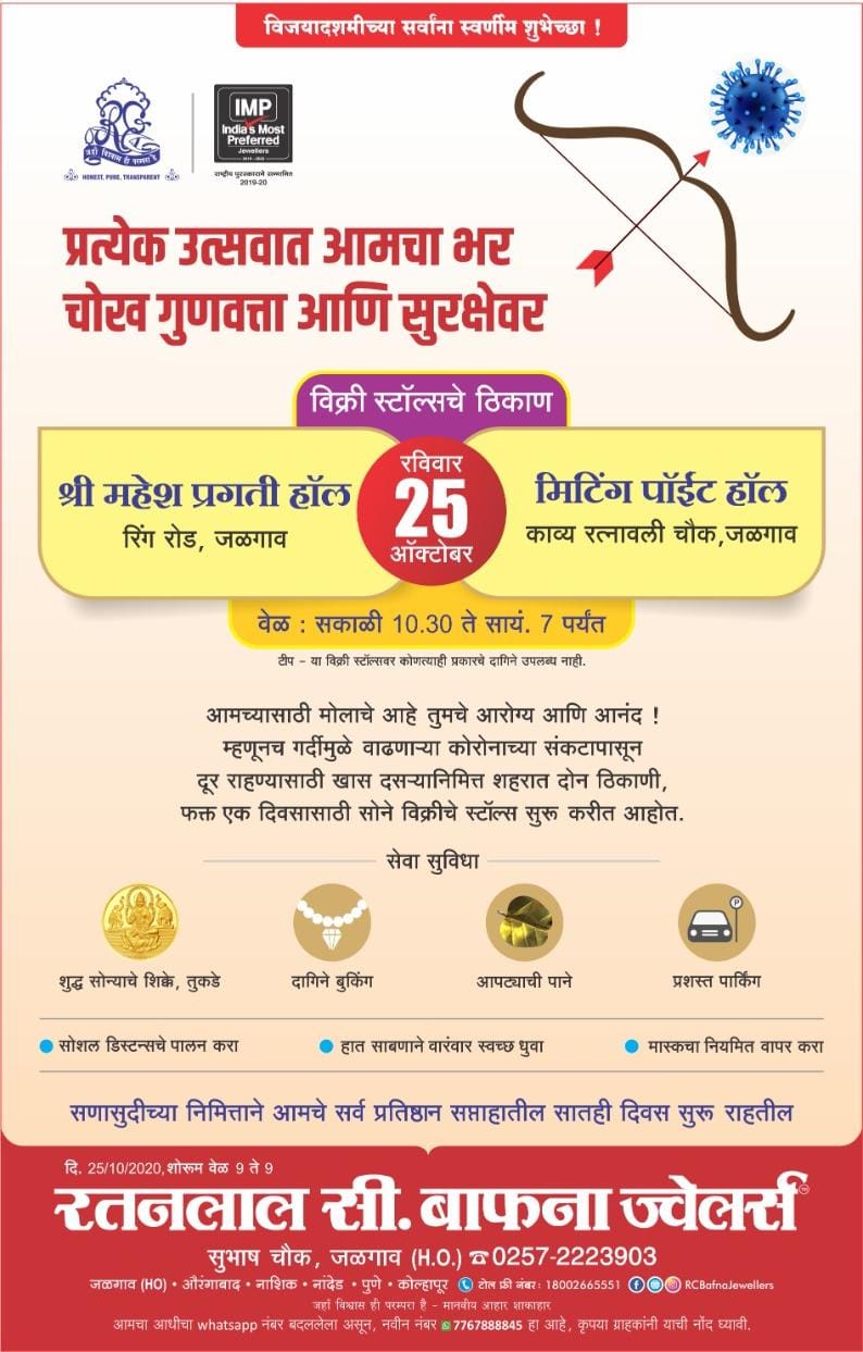जळगांव, (प्रतिनिधी) – रतनलाल सी. बाफना ज्वेलर्स तर्फे आपल्या ग्राहकांना गर्दीमुळे वाढणाऱ्या कोरोना संकटापासून दूर राहून सोने खरेदी करता यावी यासाठी खास दसऱ्याच्या मुहूर्तावर शहरातील रिंग रोडवर स्थित श्री महेश प्रगती हॉल व काव्यरत्नावली चौकातील मिटींग पॉईंट हॉल येथे विक्री स्टॉल्स सुरू करण्यात येणार आहेत.