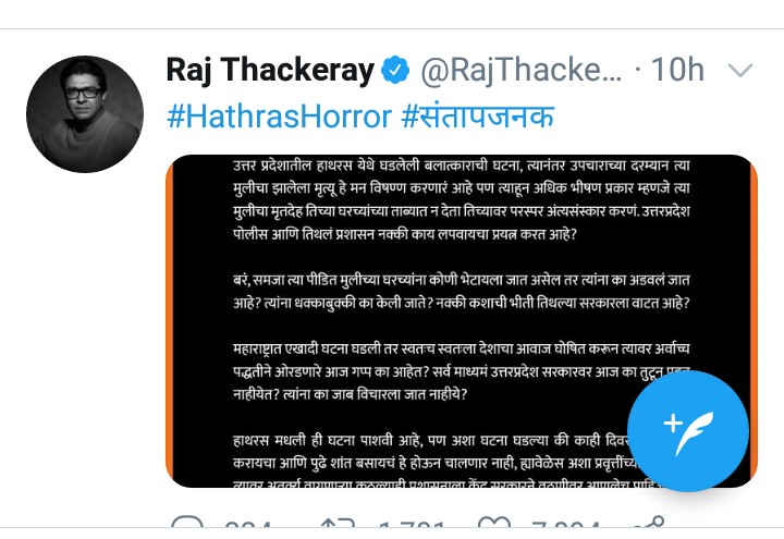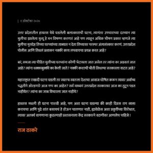 महाराष्ट्रात एखादी घटना घडली तर स्वतःच देशाचा आवाज घोषित करून त्यावर अर्वाच्च पद्धतीने ओरडणारे आज गप्प का आहेत? सर्व माध्यमं उत्तर प्रदेश सरकारवर आज तुटून का पडत नाहीयेत? त्यांना जाब का विचारला जात नाहीयेत? असे प्रश्न उपस्थित करून राज ठाकरेंनी उत्तर प्रदेश पोलीस प्रशासन, सरकार व माध्यमांवर निशाणा साधला आहे.