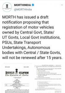 केंद्रीय परिवहन विभागाने केंद्रीय मोटर वाहन नियम अन्वय एक प्रारूप अधिसूचना जारी केलेल्या अधिसूचनेत म्हटलं आहे की, केंद्र सरकार, राज्य / केंद्रशासित प्रदेश सरकार, स्थानिक सरकारी संस्था, पीएसयू, राज्य परिवहन उपक्रम, स्वायत्त संस्था केंद्रीय / राज्य सरकारच्या मालकीच्या मोटार वाहनांची नोंदणी 15 वर्षानंतर नूतनीकरण केली जाणार नाही.