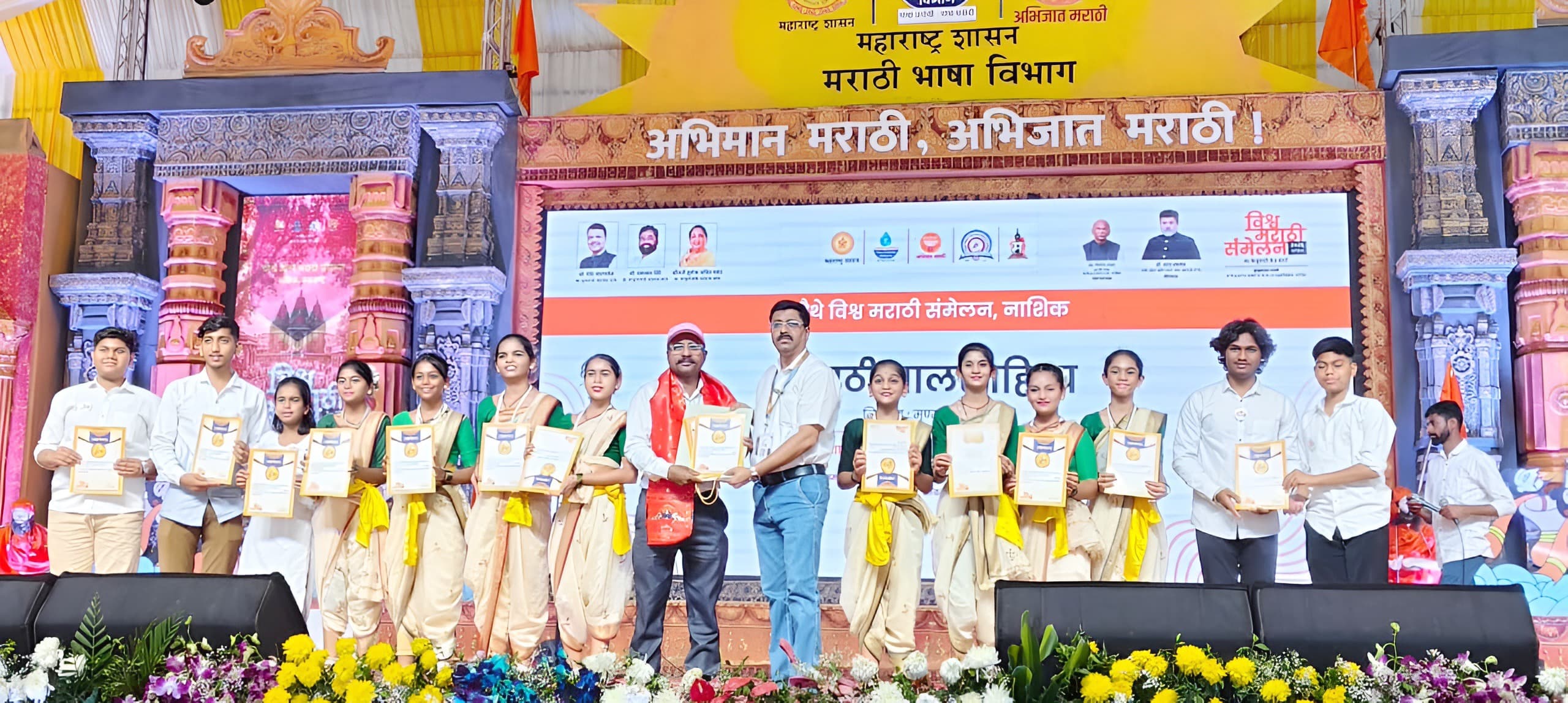 अनुभूती इंग्लिश मिडीयम स्कूलच्या मुख्याध्यापिका रश्मी लाहोटी यांच्या मार्गदर्शनाखाली नृत्य शिक्षक ज्ञानेश्वर सोनवणे यांच्या विद्यार्थिंनीं व वादकांनी नाशिकमधील विश्व मराठी संमेलनात जळगावचा झेंडा दिमाखात रोवला. या कलावंतांना बालरंगभूमी परिषद मध्यवर्ती मुंबईच्या अध्यक्षा ॲड.निलम शिर्के सामंत व प्रभारी प्रमुख कार्यवाह योगेश शुक्ल यांच्या प्रयत्नातून ही संधी मिळाली होती. या मिळालेल्या संधीचे आपल्या जोशपूर्ण नृत्याने या विद्यार्थिंनींनी सोने केले. सादरीकरणानंतर उपस्थित मान्यवरांच्या हस्ते सहभागी विद्यार्थिंनी डिंपल चौधरी, भूमिका चौधरी, रेणुका पवार, पूर्वी भावसार, चिन्मयी जंजाळकर, स्वरा महाजन, सुंदरम चिमकर, विद्या सपकाळे, चेतन धनगर, हर्षिता निकुंभ तसेच वादक मोहित सोनवणे, ललित पवार, वेदांत जडे, रोहन चव्हाण, सचिन महाजन यांच्यासह संघप्रमुख ज्ञानेश्वर सोनवणे यांचा प्रमाणपत्र व स्मृतिचिन्ह देवून गौरव करण्यात आला. अनुभूती इंग्लिश मिडीयम स्कूलचे अध्यक्ष अतुल जैन व संचालिका निशा अनिल जैन यांनी विद्यार्थ्यांसह शिक्षकांचे कौतूक आहे.