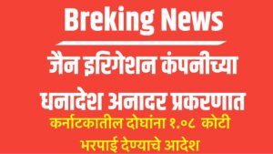 कर्नाटक राज्यातील हावेरी जिल्ह्यातील रनेबेन्नुर येथील राजेंद्र ट्रेड लिंक या भागीदारी संस्था आणि त्याचे दोन भागीदार मिथुन जैन आणि प्रशांत जैन यांनी जैन इरिगेशन कंपनीकडून घेतलेल्या मालाच्या देय रकमेपोटी ५४ लाख १० हजार २९४ रुपयांचा धनादेश दिला होता. हा धनादेश बँकेत सादर केला असता तो अनादरीत झाला. यानंतर कंपनीने कायदेशीर नोटीस पाठवूनही आरोपींनी रक्कम अदा केली नाही. अखेर याप्रकरणी न्यायालयात खटला दाखल करण्यात आला. न्यायालयाने दोन्ही बाजूंचा युक्तिवाद आणि उपलब्ध पुरावे ग्राह्य धरून निकाल दिला. न्यायालयाने दिलेल्या निकालात १ कोटी ८ लाख २० हजार ५८८ रुपये जैन इरिगेशनला देण्याचे आदेश दिले आहे. तसेच आरोपींना ६ महिने साधा कारावासाची शिक्षा सुनावली आहे. कायदेशीर कारवाईचा खर्च म्हणून जैन इरिगेशन कंपनीला अतिरिक्त १५ हजार रुपये देण्याचे आदेशही निकालात दिले आहे. जैन इरिगेशन कंपनीच्या वतीने ॲड. निशांत सुशील अत्रे यांनी प्रभावीपणे युक्तीवाद करत कंपनीची बाजू मांडली.