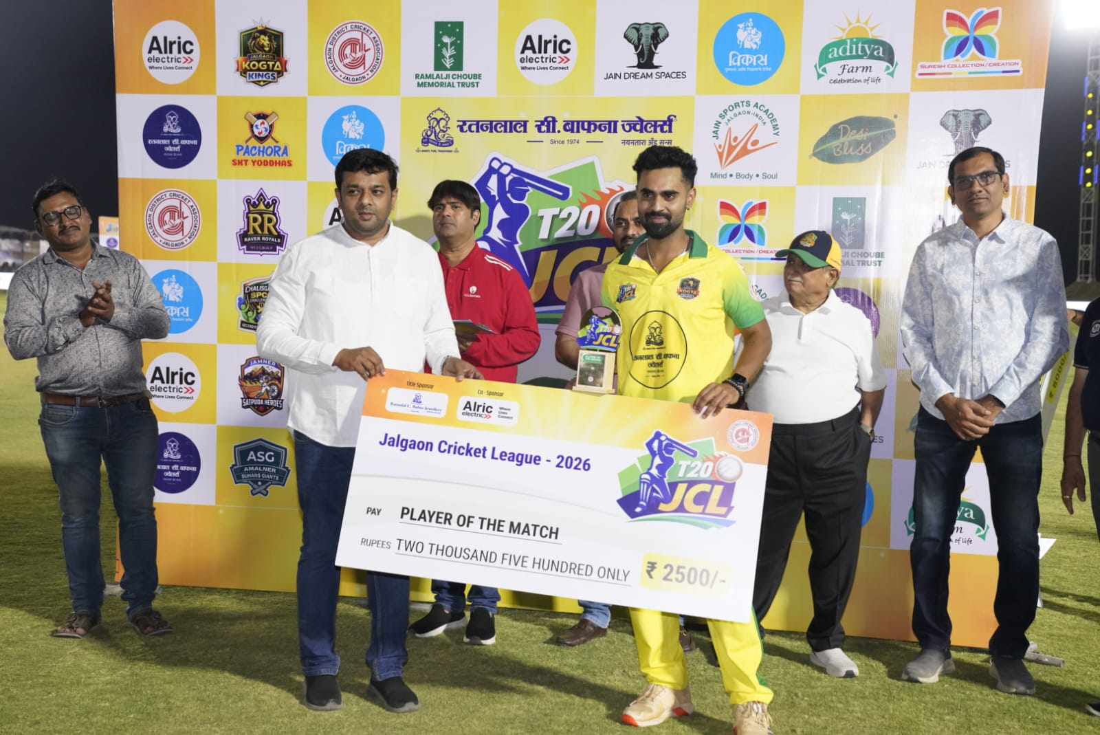 जळगाव दि.१९ प्रतिनिधी – मेहरूण तलावाजवळील कांताईनगर येथील जैन ड्रीम स्पेसेस च्या भव्य क्रीडांगणावर सुरु असलेल्या जळगाव क्रिकेट लिग-२०२६, JCL T-20 स्पर्धेत रोमांच वाढत आहे. जळगाव जिल्हा क्रिकेट असोसिएशनच्या वतीने व रतनलाल सी. बाफना ज्वेलर्स प्रायोजीत व अलरीक इलेक्ट्रीकल्स सहप्रायोजकत्वाखाली आयोजित जळगाव क्रिकेट लिग चा तिसऱ्या सामना अमळनेर सुहांस जायंटस विरूद्ध जळगाव कोगटा किंग यांच्यात खेळविण्यात आला.