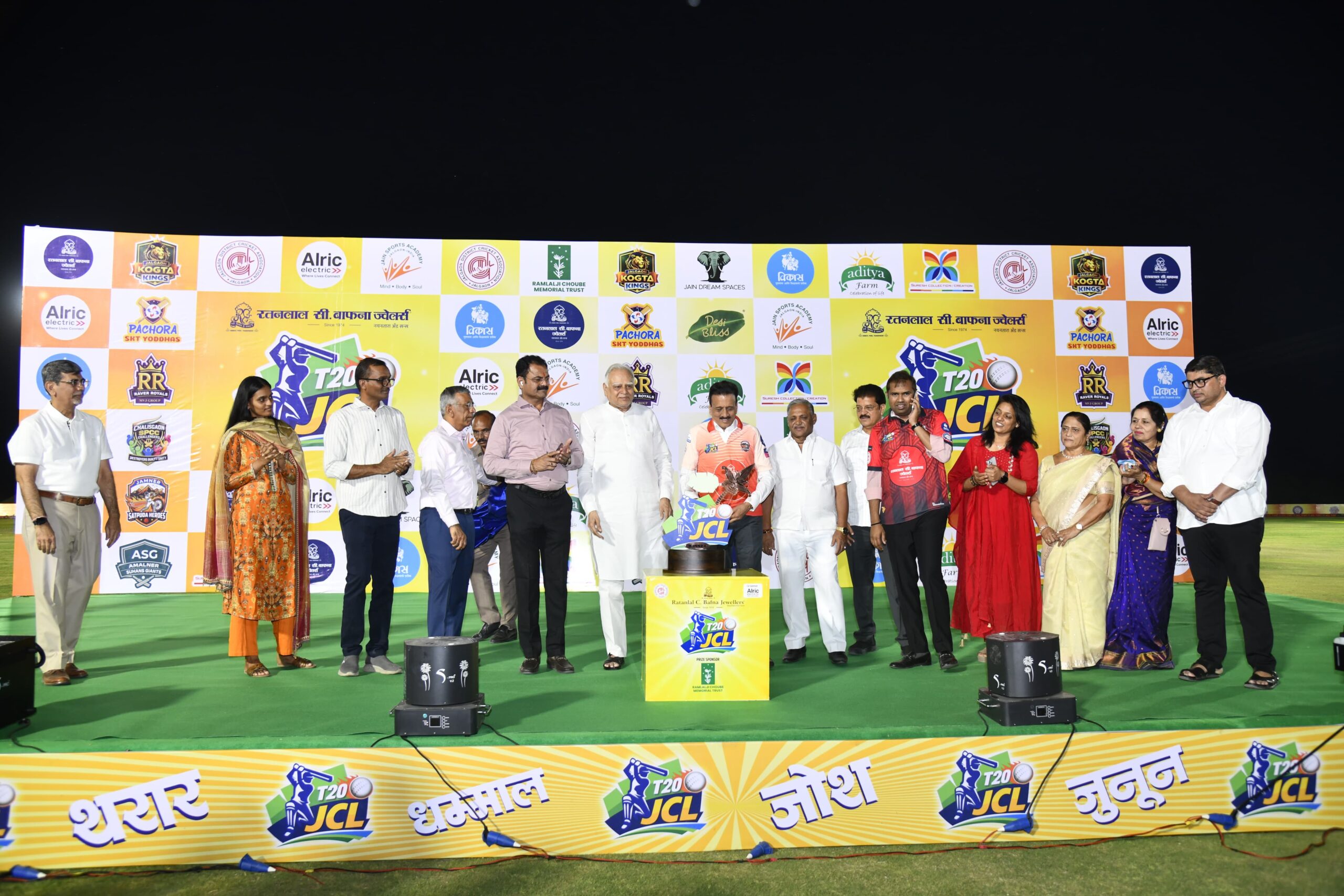 मान्यवरांच्या उपस्थितीत जळगाव क्रिकेट लीगच्या ट्रॉफीचे दिमाखानात उद्घाटन करण्यात आले. त्यानंतर शानदार सांस्कृतिक कार्यक्रम झाले. फटाक्यांची आतषबाजी करण्यात आली.