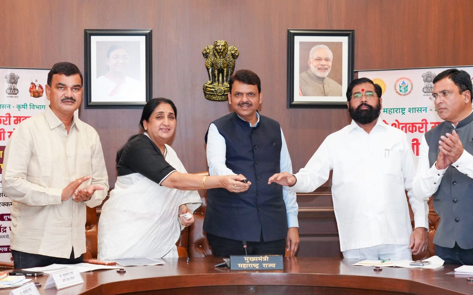 विधान भवन, मुंबई येथे ‘नमो शेतकरी महासन्मान निधी’ योजनेचा आठवा हप्ता वितरण समारंभ झाला. यावेळी उपमुख्यमंत्री एकनाथ शिंदे, उपमुख्यमंत्री सुनेत्रा अजित पवार, कृषी मंत्री दत्तात्रय भरणे, उद्योग व मराठी भाषा मंत्री डॉ. उदय सामंत, शालेय शिक्षण मंत्री दादाजी भुसे, राज्यमंत्री ॲड. आशिष जयस्वाल, कृषी विभागाचे अपर मुख्य सचिव विकासचंद्र रस्तोगी तसेच वरिष्ठ अधिकारी उपस्थित होते.