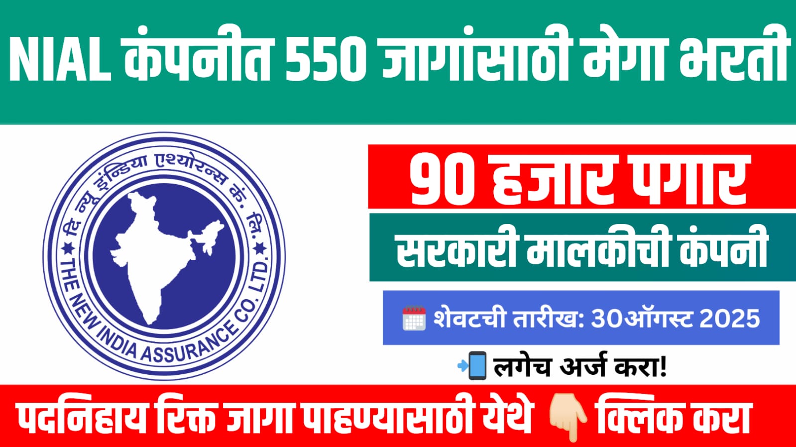 NIACL Recruitment 2025: न्यू इंडिया ॲश्युरन्स कंपनी लिमिटेडमध्ये 550 प्रशासकीय अधिकारी पदांसाठी भरती सुरू. अर्जाची अंतिम तारीख 30 ऑगस्ट 2025. निवड झालेल्यांना दरमहा 90,000 रुपये पगार आणि आकर्षक सुविधा मिळणार.