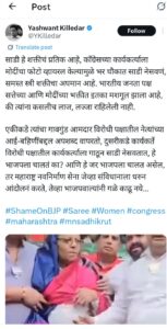 साडी हे शक्तीचं प्रतिक आहे, काँग्रेसच्या कार्यकर्त्याला मोदींचा फोटो व्हायरल केल्यामुळे भर चौकात साडी नेसवणं, समस्त स्त्री शक्तीचा अपमान आहे. भारतीय जनता पक्ष सत्तेच्या आणि मोदींच्या भक्तीत इतका मशगूल झाला आहे, की त्यांना कसलीच लाज, लज्जा राहिलेली नाही.